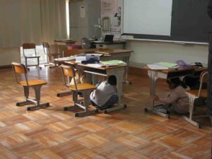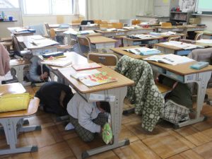 児童は、速やかに机の下に潜り込んだり、運動場でカエル・ポーズを取ったりして、身の安全を確保していました。