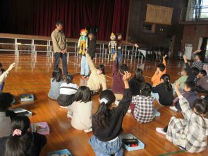 劇団むすび座ワークショップ 劇団むすび座ワークショップ 2025年11月19日 futamuradai-es 12月4日に、劇団むすび座をお招きして、人形劇を観させていただきます。 先週、人形を持って来校され、人形の取り扱いについてのワークショップを開催しました。 子どもたちは人形を触って、歩かせたり、ジャンプさせたりする動作を体験しました。 人形に命を吹き込むことの難しさを感じ取れたようです。 本番、どんな人形劇になるか楽しみです。