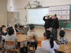 3年生英語授業 3年生英語授業 2026年3月17日 futamuradai-es 3年生が英語の授業で、寸劇を行っていました。 かわいい動物に扮して、英語で問いかけます。 児童たちの会話が次々つながり、最後に担任の先生が登場して笑いが起こります。 楽しみながら英語の授業に参加していている様子が伝わってきました。