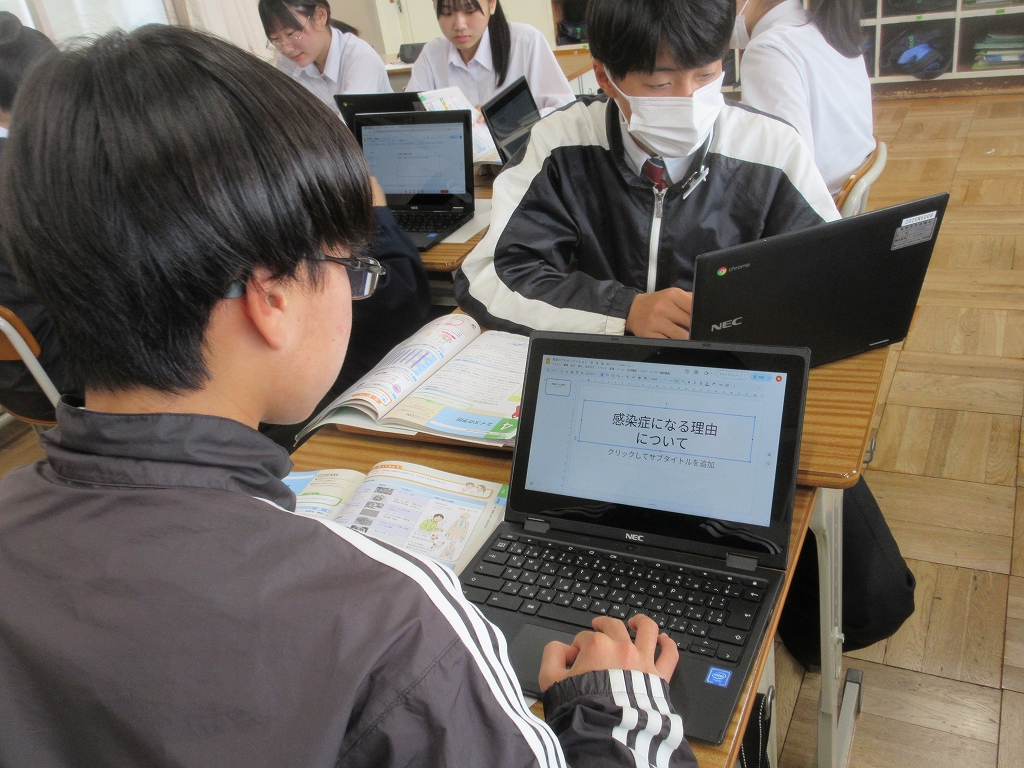 2年社会科「日本の地域的特色」では教育実習生が研究授業を行いました。日本の気候の特色についてペア毎に分担して調べ学習を進めていました。授業後、大学の担当教官から授業の振り返りをしているところをパチリ。将来、現場での活躍を期待していますよ。他の3人はあと1週間実習が続きます。