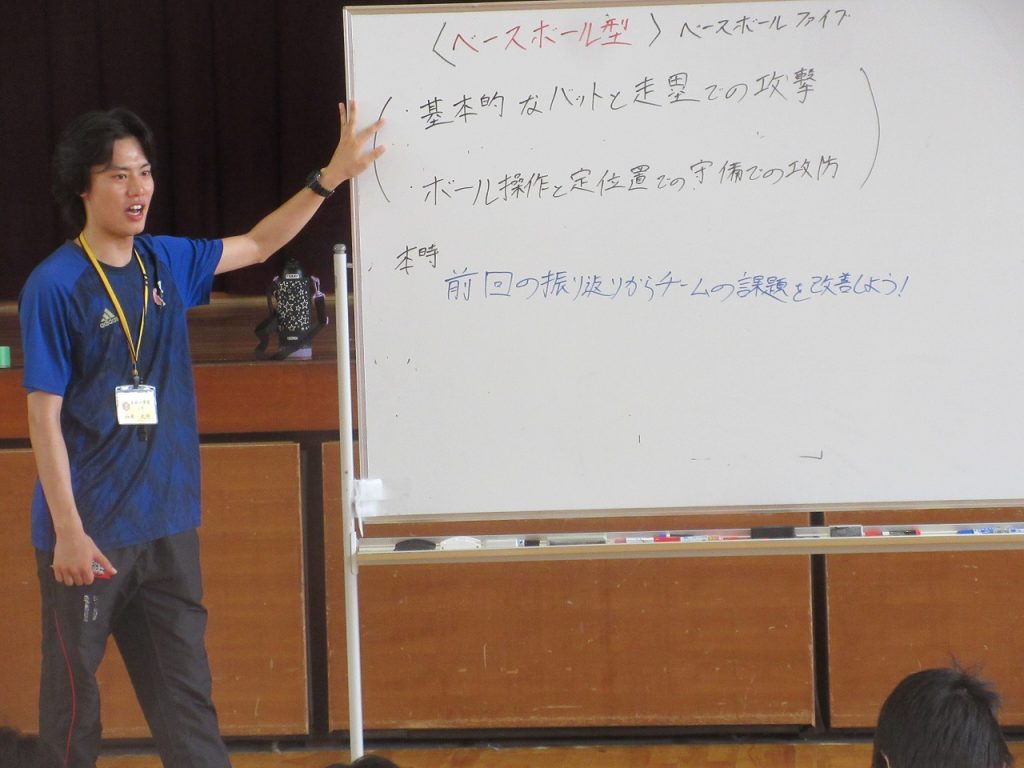2年体育「ベイスボールファイブ」の授業では市の学校教育指導員が見守る中、研究授業が行われました。雨天の関係で体育館に場所を変えて行っていました。蒸し暑かったですが楽しんで活動していましたね。野球が苦手な生徒もこれなら楽しめそうです。