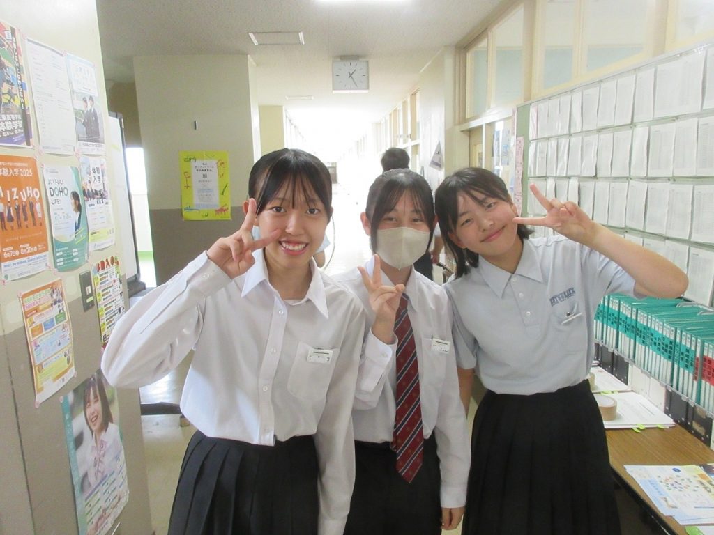昼放課職員室前の掲示板前でカードに記入をしていた生徒が「1年生も書いていいですか?」と聞かれたので「もちろんだよ。」と。図書館を出た後の進路室前と2年生の教室で楽しそうに先生と過ごしていたのでパチリ。