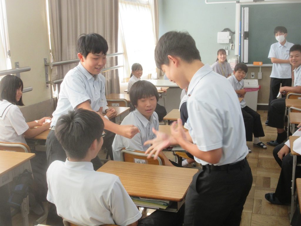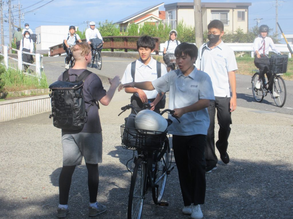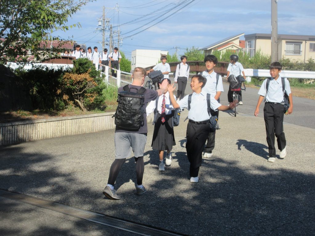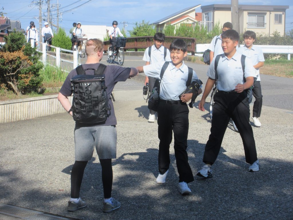 朝いつものように校門であいさつをしていると自転車通勤のALTが途中から一緒に生徒の出迎えを行ってくれました。タッチでコミュニケーションをとりながら楽しそうにあいさつする姿が微笑ましかったです。