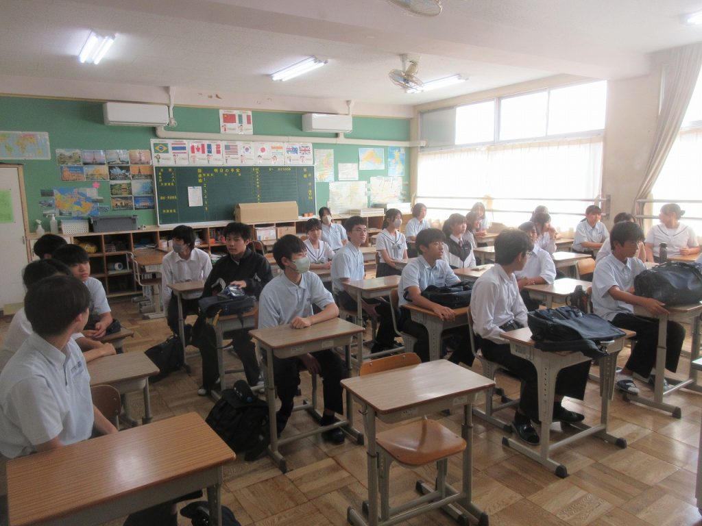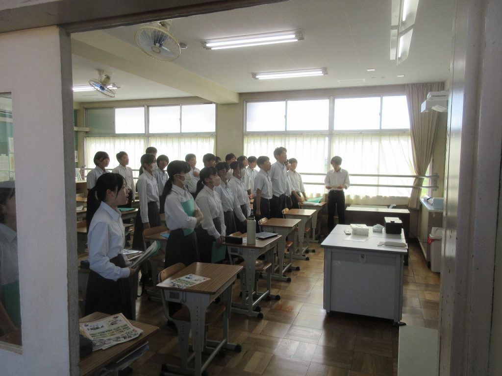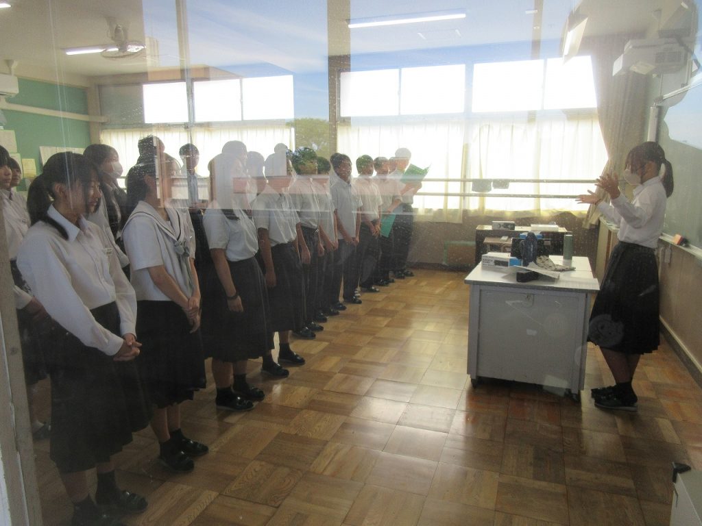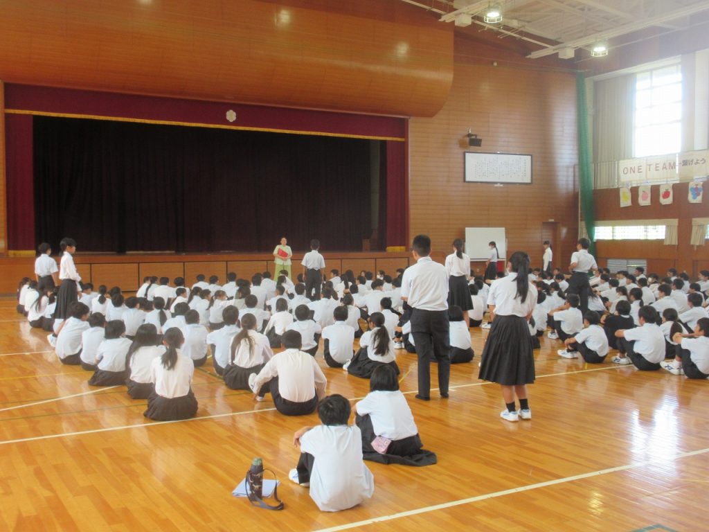 校長講話の後、生徒会から「ユニセフ募金(9月30日~10月1日)」と「クツルール」について話がありました。クツルールの根幹は「考えて行動する」です。これからも最高のルール作りに期待します。
