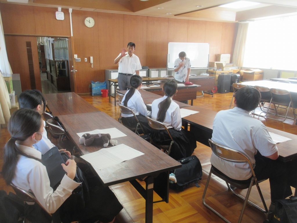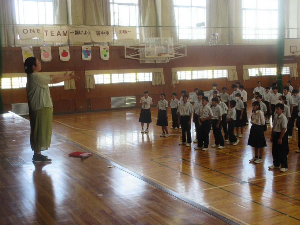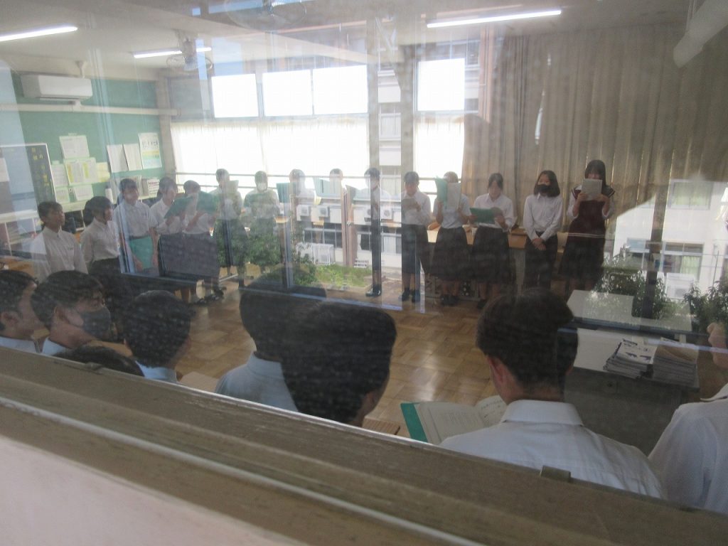 テストが終了した3限の様子です。1年生は歌声の会の指揮者・伴奏者・パートリーダーを紹介後、みんなから温かい拍手が送られていましたね。最後に呼吸法を伝授されていました。