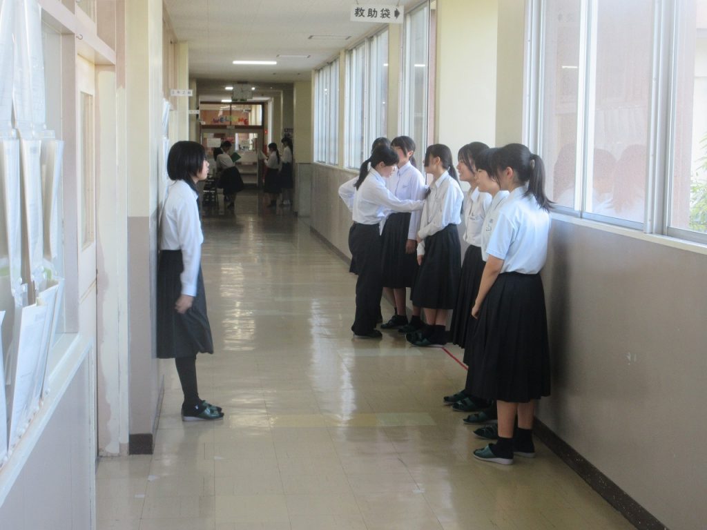 来週22日月曜日に後期生徒会役員選挙が行われます。立候補者が給食の時間に選挙活動で各クラスを回っていました。少し緊張していましたがやる気をすごく感じました。昼放課に選挙ポスターを見ている人をパチリ。まだ見てない人はぜひ見に来てくださいね。
