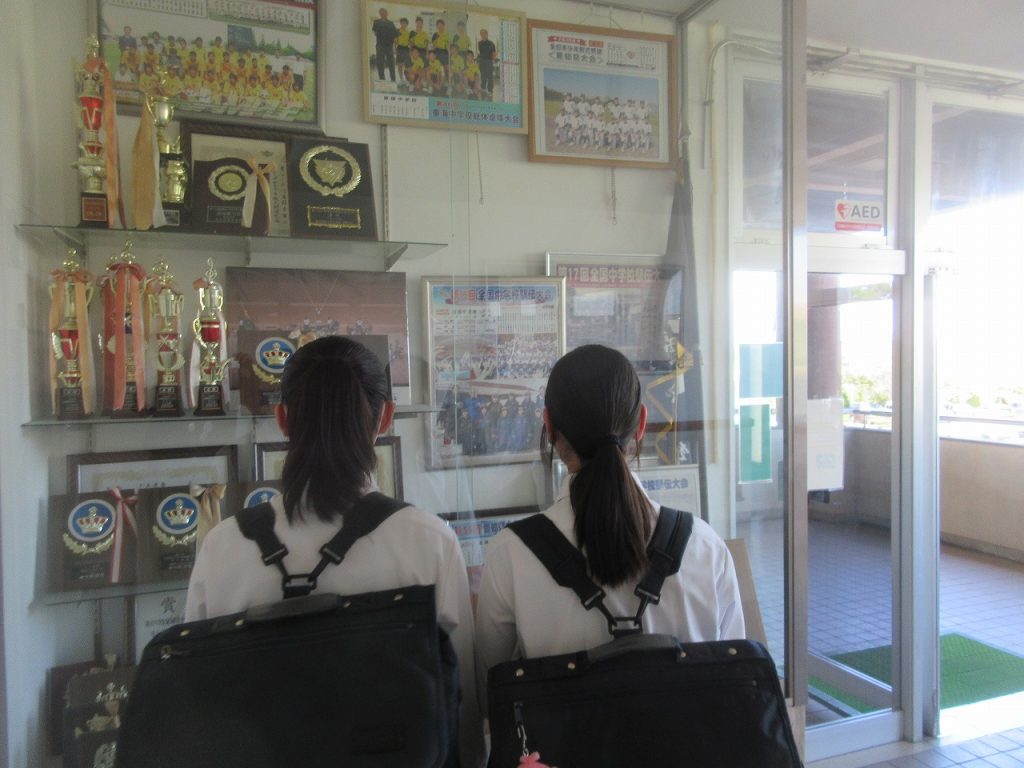 みんながテストを受けていた時間に、給食配膳員さんが各階の配膳室の掃除をしてくれていました。みんなが安全に給食が食べれるように見えないところで活躍していることも知っておいてくださいね。また、業後ボランティアで早く集まっていた生徒が、来賓玄関の写真を見ていました。知っている人が写っているのでしょうか?