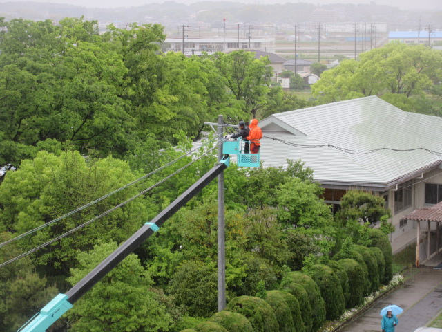 現在、体育館と和敬館のエアコン設置工事を行っています。今日は、雨の中、クレーン車で作業していました。ありがとうございます。
