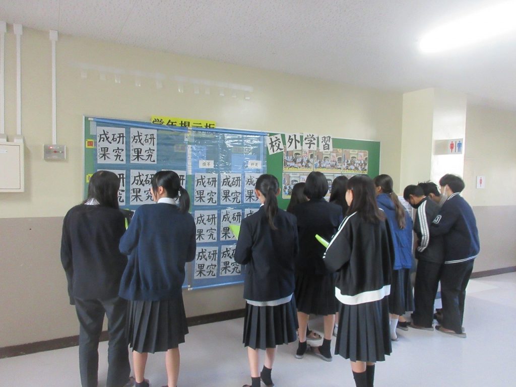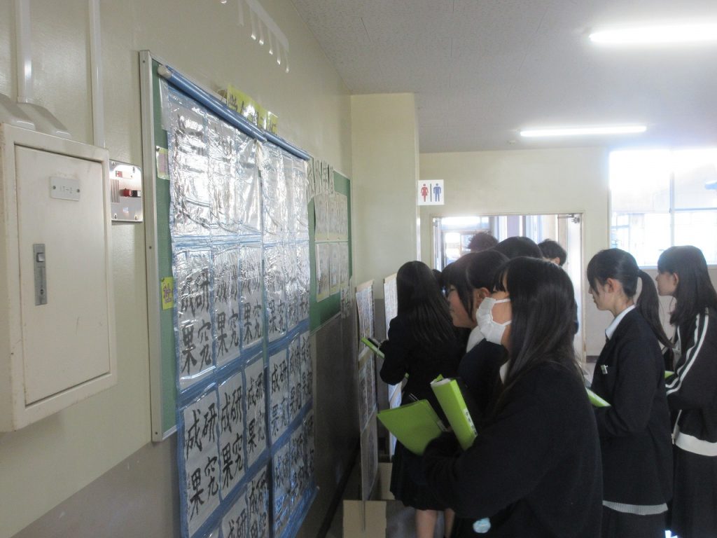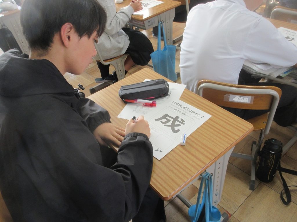 2年生が毎月実施している今月の目標の漢字、12月の漢字は「成」。学習や部活、習い事などについての成長・成果・成功につながる目標を書いている人が多くいました。中でも受験に向けて1年後の自分の姿を想像して書いている人もいました。