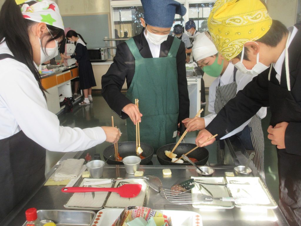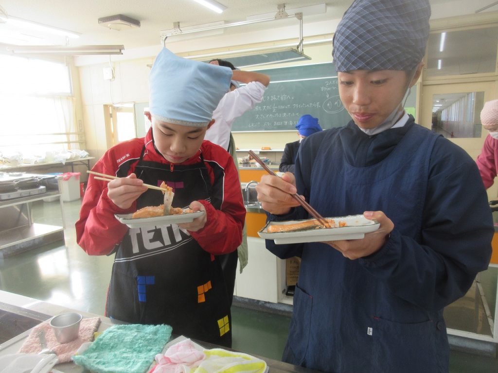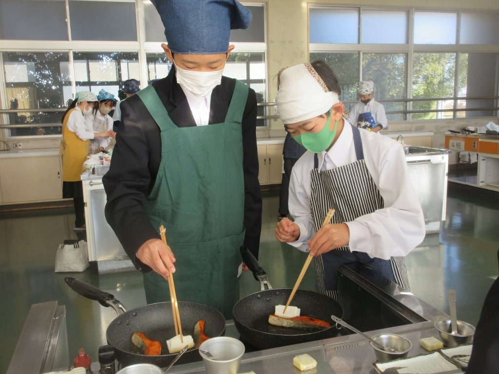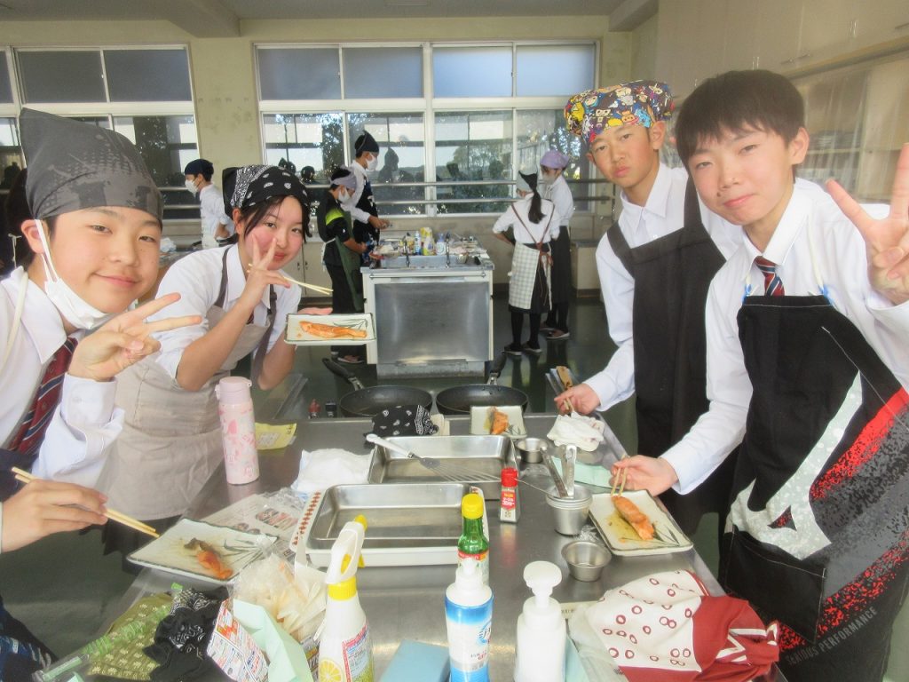 1年生家庭科「鮭のムニエル」の調理実習では、焼いた鮭の仕上げにバターとレモン汁をフライパンに入れた時のおいしい香りがたまりませんでした。口に入れた瞬間「美味しい」と笑顔をあふれていましたね。