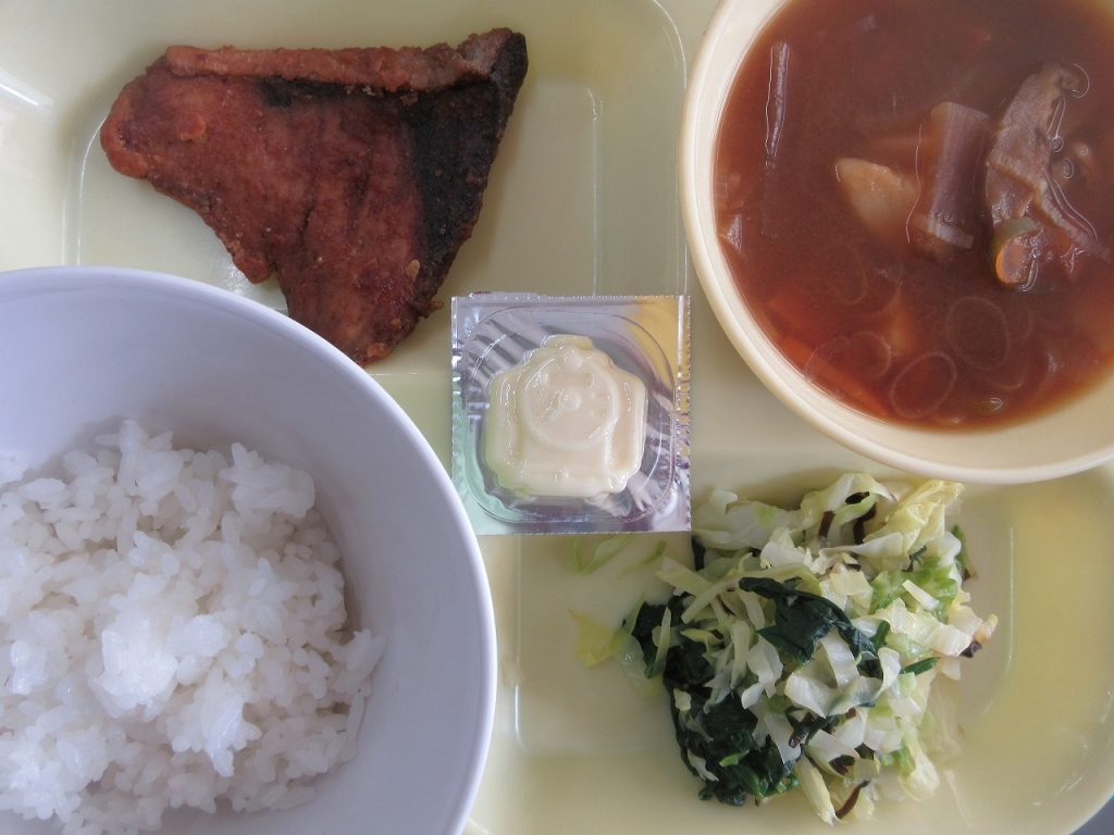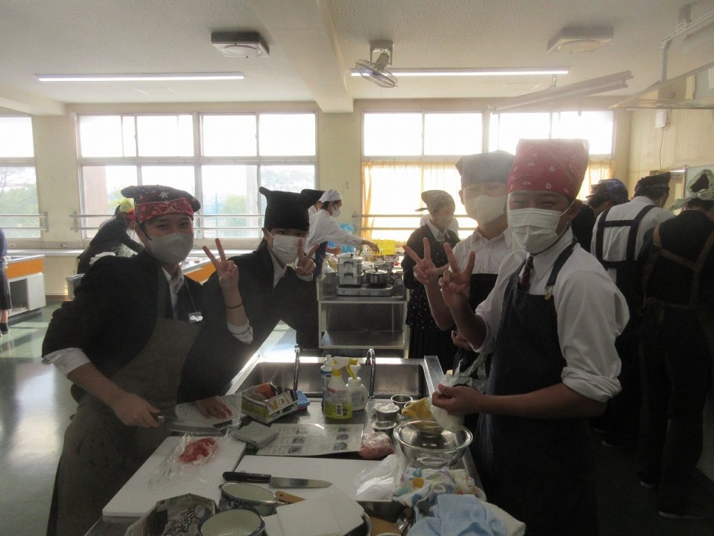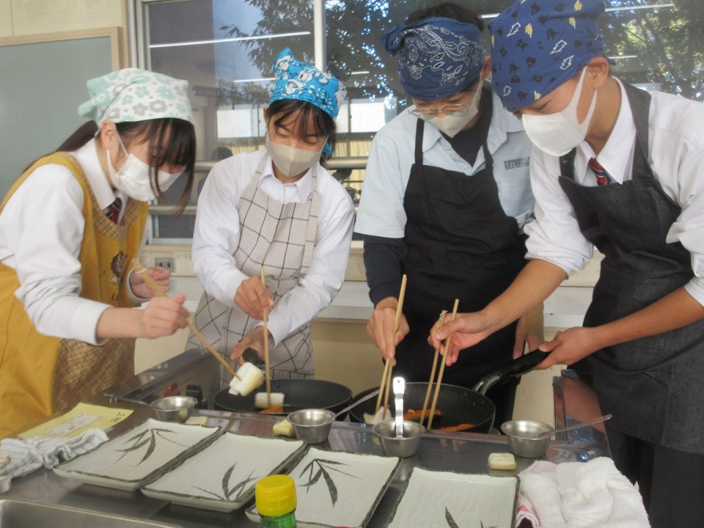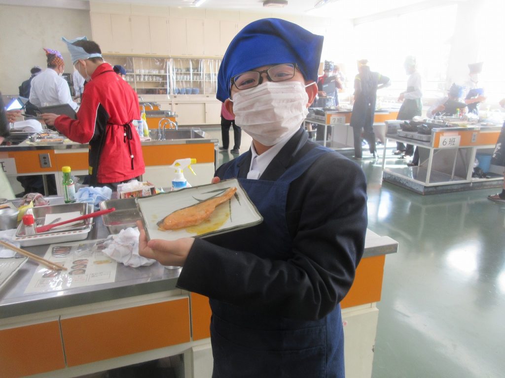 1年生家庭科「鮭のムニエル」の調理実習では、焼いた鮭の仕上げにバターとレモン汁をフライパンに入れた時のおいしい香りがたまりませんでした。口に入れた瞬間「美味しい」と笑顔をあふれていましたね。