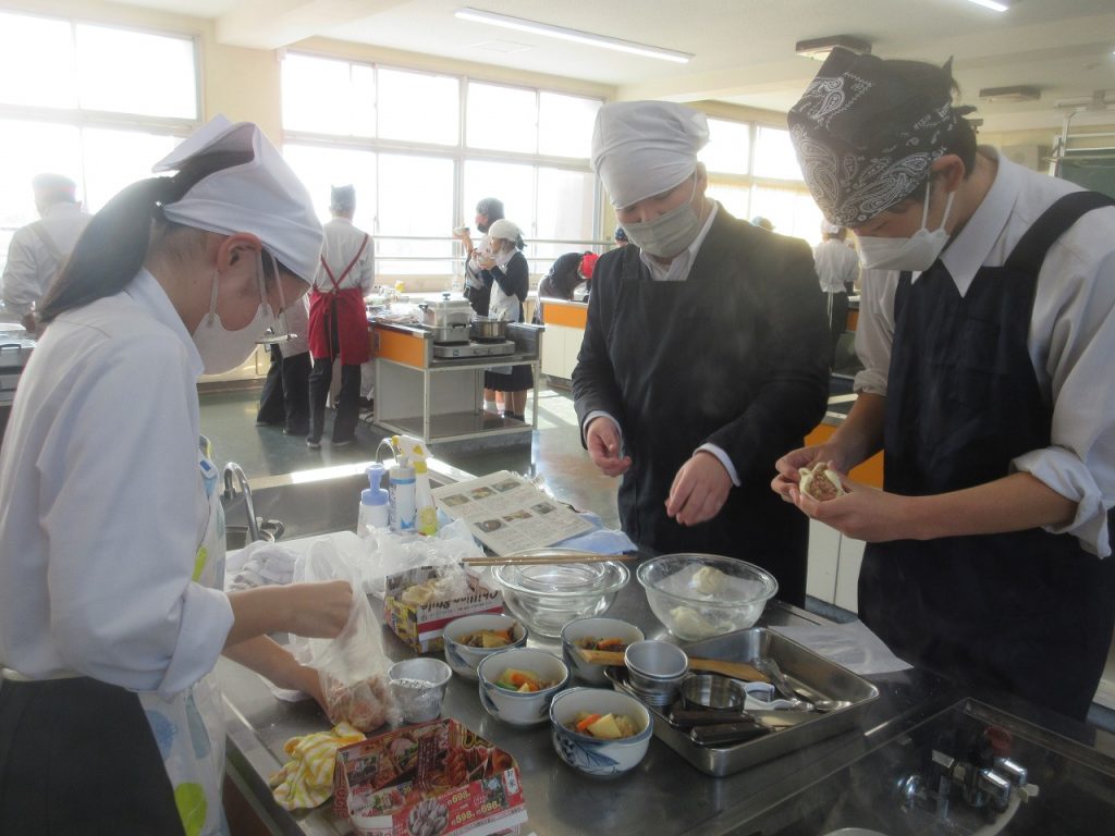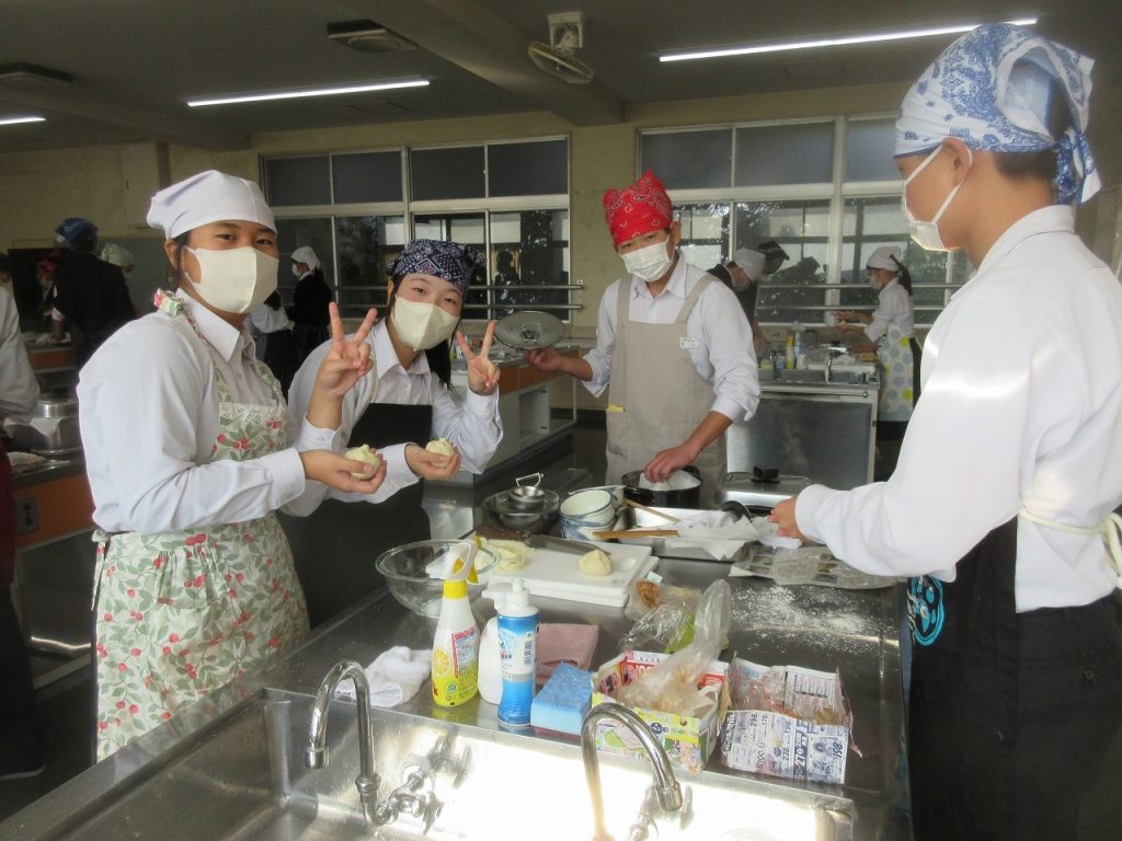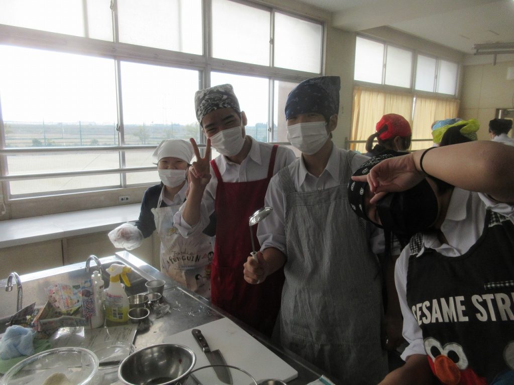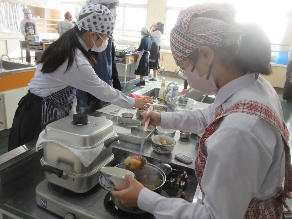 3年家庭科「肉じゃが・肉まん」の調理実習をしているところをパチリ。お湯を入れるところに水を入れたり、水の量を間違えたりのハプニングを乗り越え何とか完成し、美味しく食べていましたね。