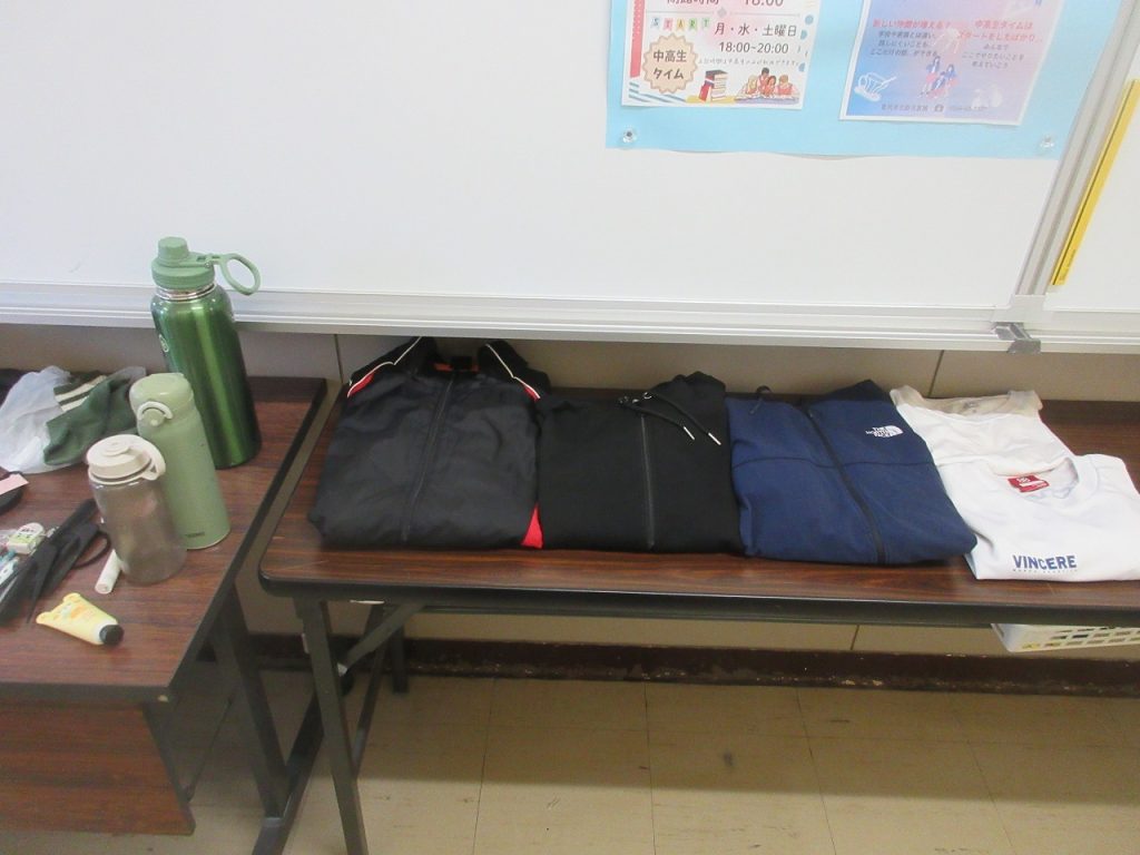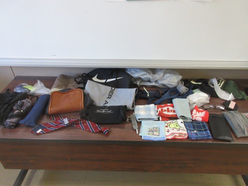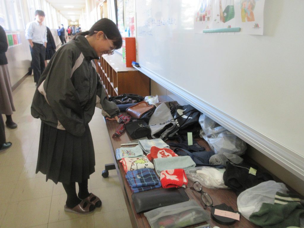 掲示物パート2「落とし物」毎学期掲示していますが、職員室前にこの2学期に落ちていたものを展示してあります。ネクタイもありました。裏に名前は書いてありませんでしたが「M・S」と記入されていました。早く見つけてあげてください。