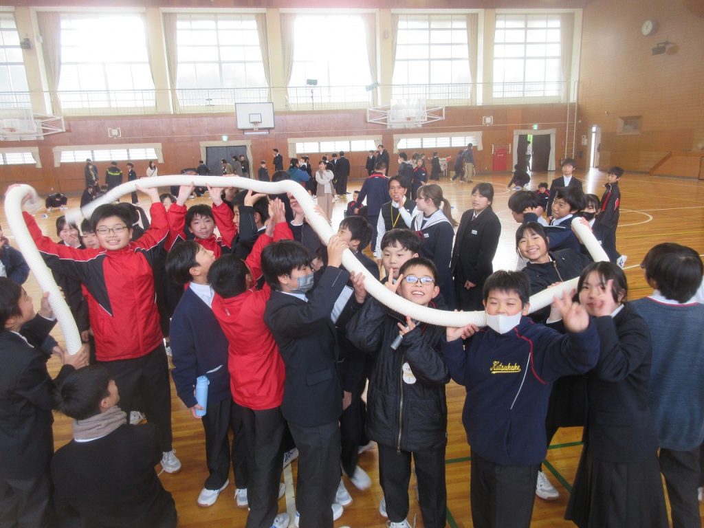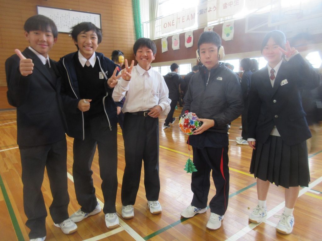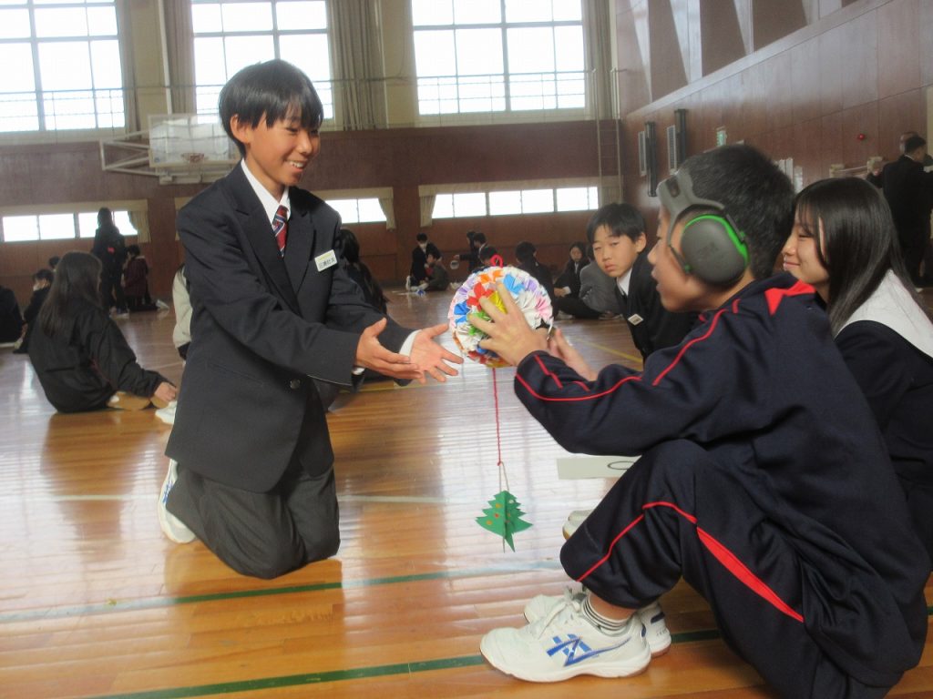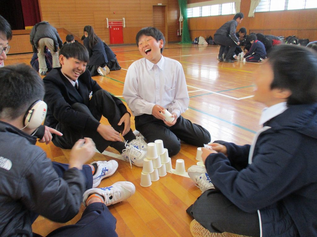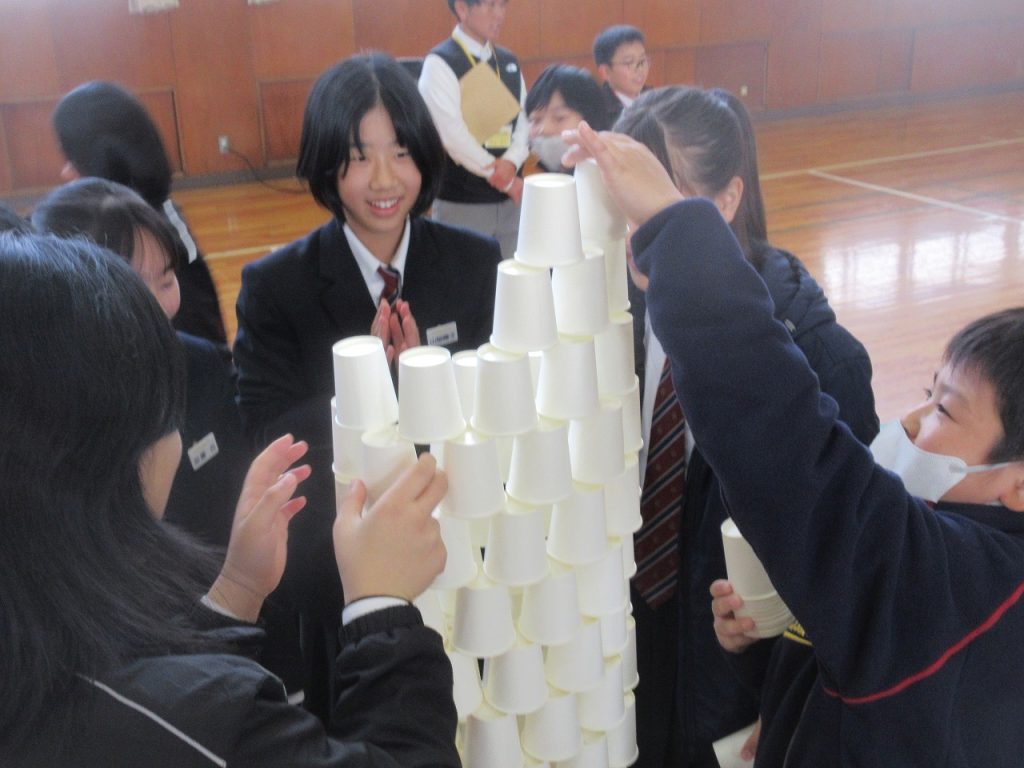 大府もちのき特別支援学校と初めての交流会を行いました。前半1~3組がダンスの交流をしました。沓中はジャンボリーミッキーを踊り、もちのきの生徒は歌に合わせて手話をしたりリボンを使って踊りを披露したりしてくれました。後半4~6組はペア交流で、紙コップタワーを作りました。帰り際に「交流会楽しかった?」と尋ねると「楽しかった」と笑顔で答えてくれました。