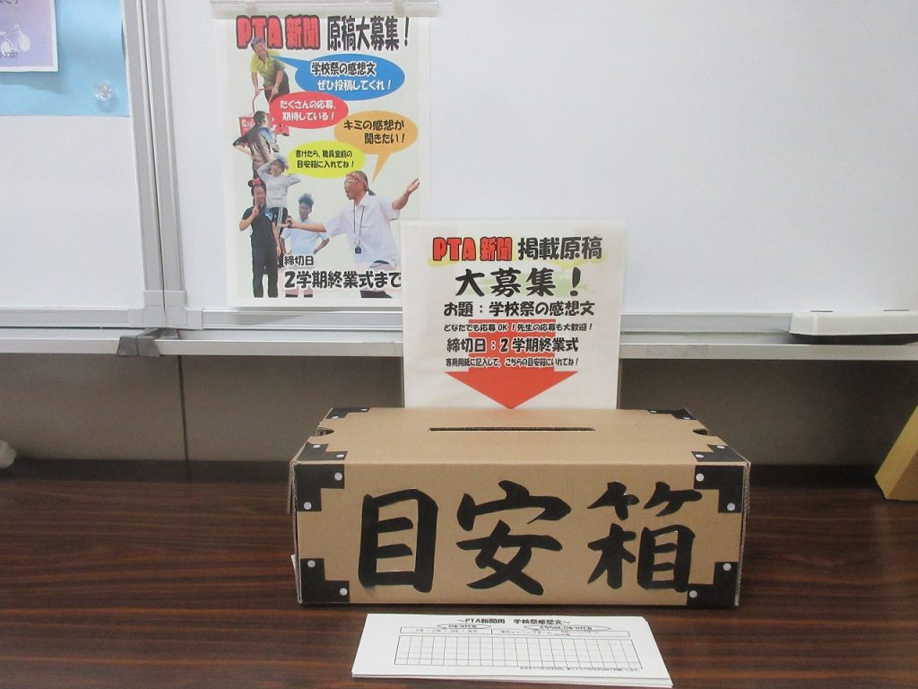 PTA広報部の方がお昼の放送で、全校生徒にPTA新聞用の原稿依頼をしていました。今回は「学校祭の感想」の依頼です。職員室前廊下に案内と用紙が置いてあるので、ふるって応募をしてくださいね。昨年度に引き続き、愛知県PTA広報誌の最高賞を狙っているとのコメントがありましたね。保護者の主体性に負けない沓中生の主体性を行動で是非。