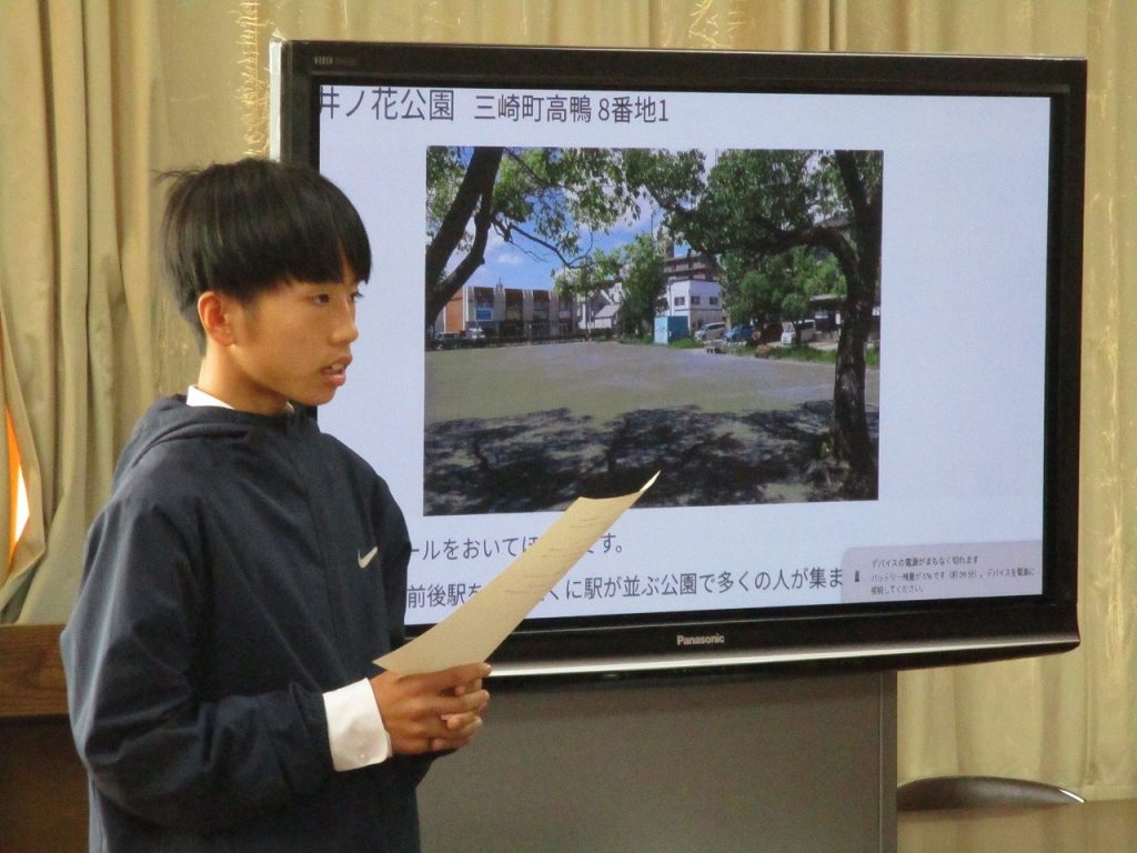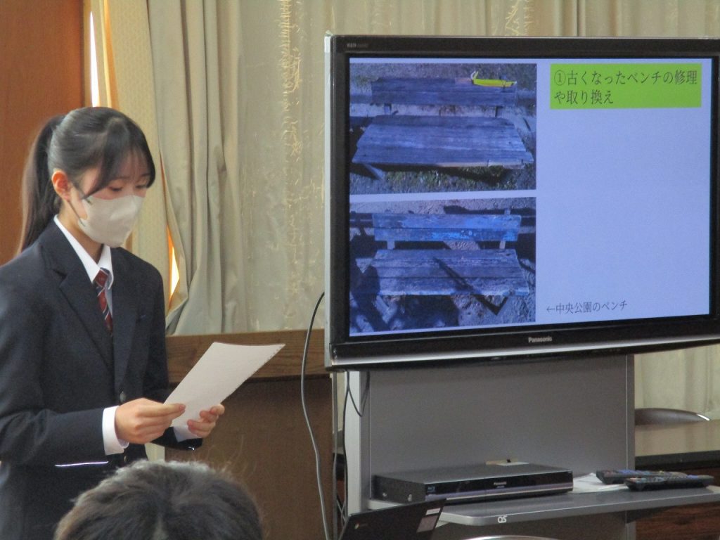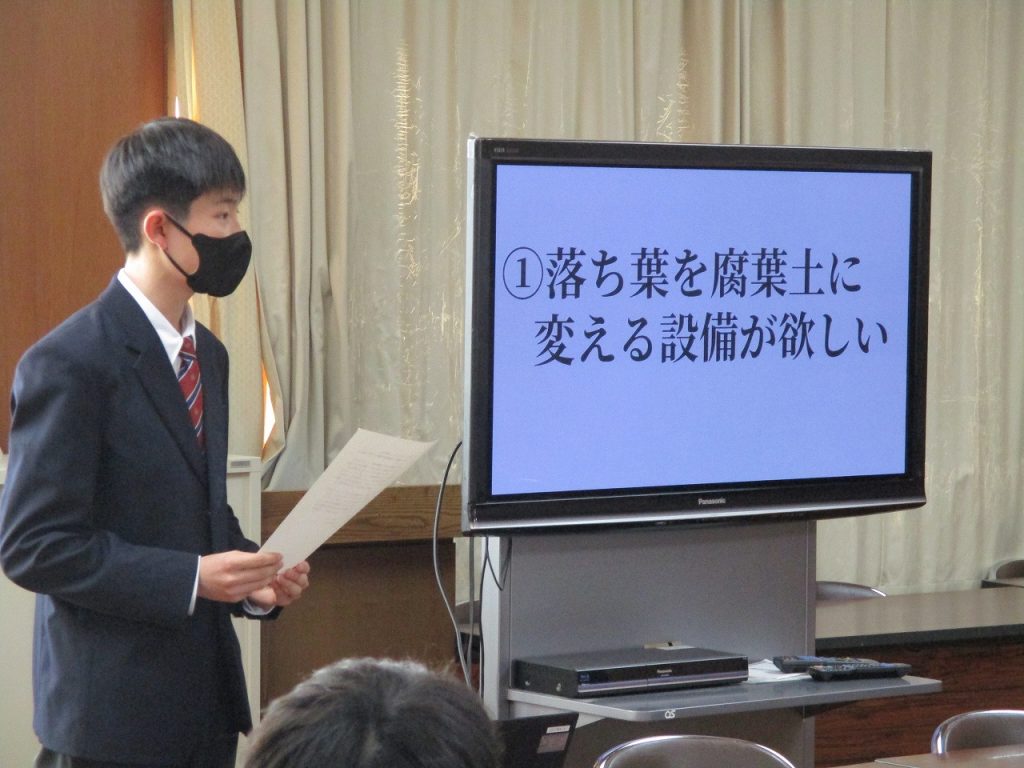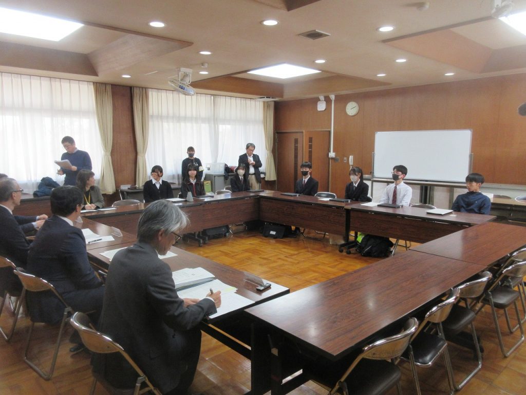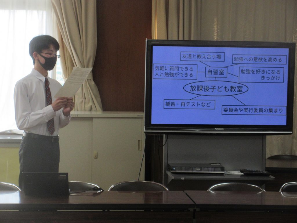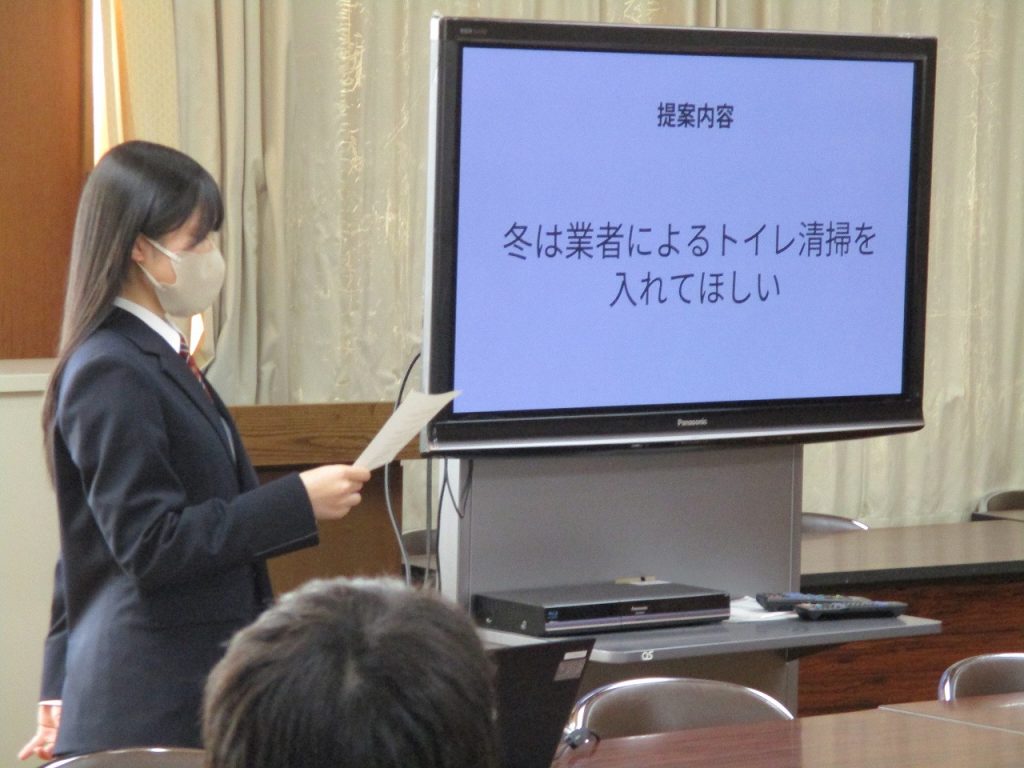 午後会議室で市長と話そう会が行われました。内容は「公園にサッカーゴールを設置してほしい」「中学校版『放課後子ども教室』の設置をお願いしたい」「公園の環境整備」「SDGsに配慮した清掃環境の整備」「冬のトイレ清掃を業者にしてほしい」「街灯を増やしてほしい」「学校の図書館を放課後も開放してほしい」の7つの提案がありました。どの生徒もパワーポイントにわかりやすくまとめ発表していたので市長から褒められていましたね。それぞれの提案に市長も丁寧に答えてくれていました。どの内容も実現されるといいですね。