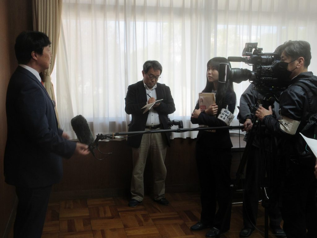 今回テレビ局と新聞社が合わせて4社取材に来ていましたが、市長と話そう会の後「スマホ条例」について囲み取材を行っているところをパチリ。その後市長とPTA広報の方で話が盛り上がっていました。