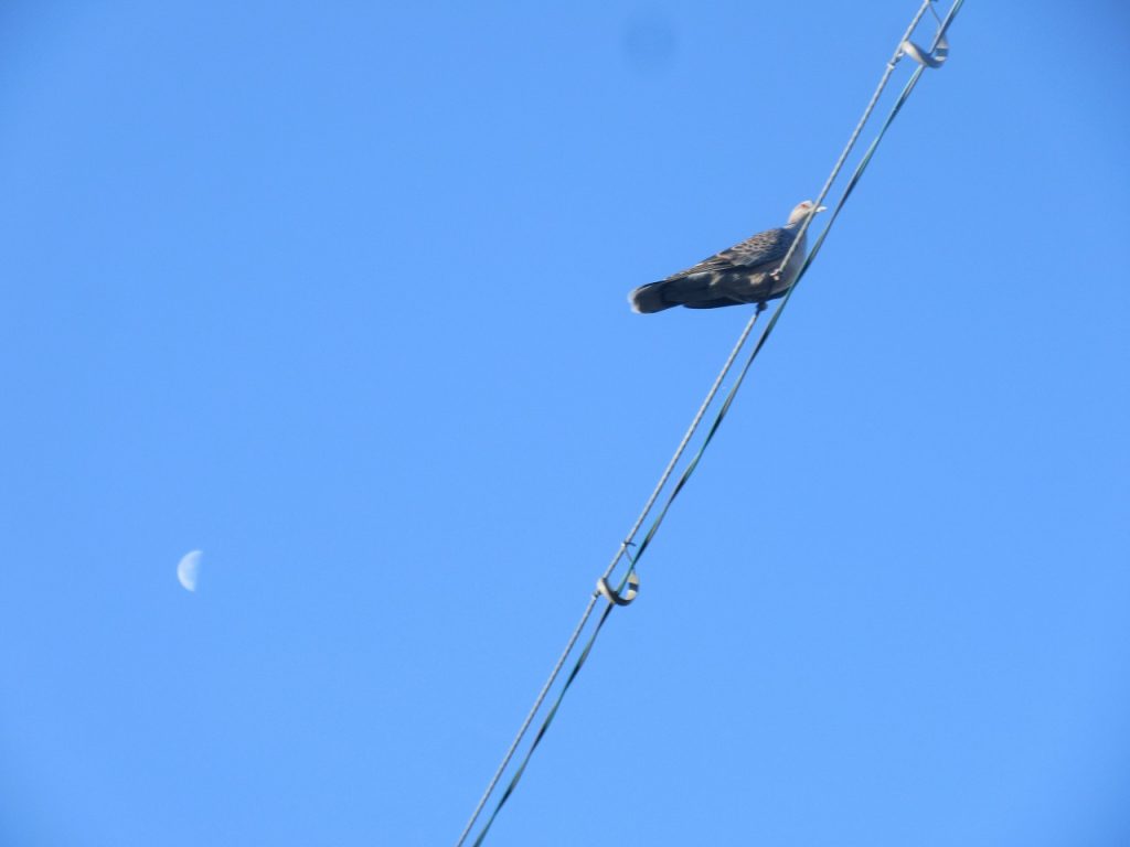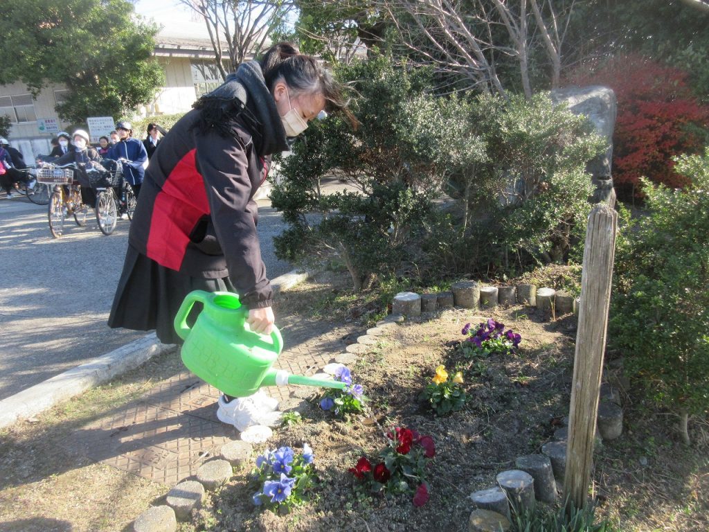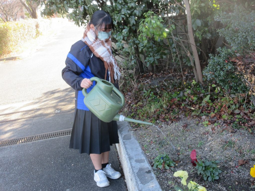 朝から強風の1日でした。鳩は、うまくバランスをとって風にゆれる電線の上に乗っていました。下校時は環境委員の人がパンジーに水やりをあげていました。
