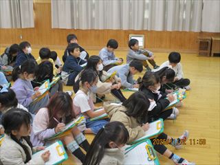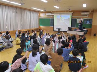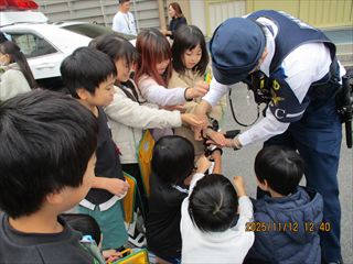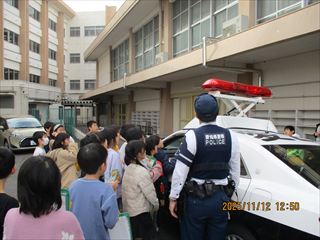 11月12日(水)の3・4限に、3年生が警察署のパトカー出前授業を行いました。愛知警察署の方に来ていただき、最初に多目的室で学年全体で交通安全について話を聞きました。その後、クラスごとに分かれて、屋外でパトカーを実際に見たり、警察官の仕事の内容についても話を聞いたりしきました。本物のパトカーを見せてもらったり、実際に警察官が使っている警棒や手錠などの道具にもふれさせてもらったりする中で、楽しみながら多くのことを学びました。