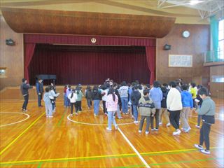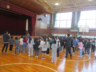 本校の授業で取り組んでいる「考えを聴き合い、学び合う児童の育成」に向けて、現在、本校では、「聴く」力の育成に取り組んでいます。この12月と1月は、「聴く褒め褒め月間」として、聴き方名人「あいうえお」の合言葉を練習しています。それをより子どもたちに意識してもらうために、子どもたちに有志で「聴き方大使」を募集することにしました。12月15日(月)のみさきタイムに、たくさんの児童が集まりました。 教師のかけ声に合わせて、何回も練習しました。これからの活動が楽しみです。