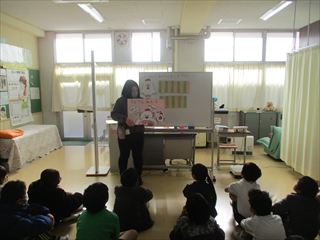 三崎小学校では、学期に1回身体計測を行っています。その身体計測のときに、養護教諭が保健指導を行っています。この日は、4年生に睡眠について話をしていました。子どもたちは、養護教諭の話を興味深く聞いていました。これからも保健指導を通して、子どもたちの健康をよりよいものにしていきたいと思います。