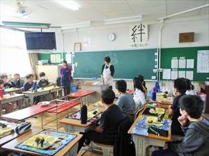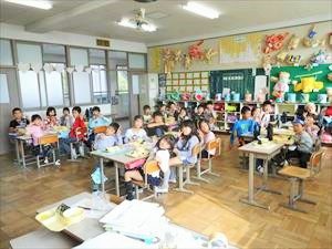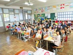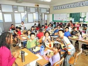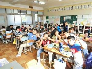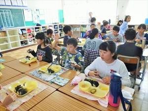 にぎにぎ会のメニューは、「おにぎり、ふかしイモ、たくあん、ゼリー」です。各クラスごとにPTA委員さんより、「大宮農園に感謝の気持ちをもってほしい」というお話をしていただき、会食をしました。どのクラスも笑顔いっぱいの会食となりました。新米のおにぎりは、とても美味でした。サツマイモも、柔らかくてほどよい甘さでした。5年生、6年生のみなさん、おいしいお米とサツマイモをありがとう!そして、本日、にぎにぎ会の準備をしてくださった皆様、本当にありがとうございました。