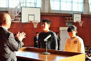 児童会長から通学団長に表彰状が渡されました。