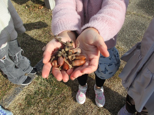 1年生のみなさんが、坂畑公園で冬の自然を見つけました。大きなどんぐりの実やカマキリの卵がありました。