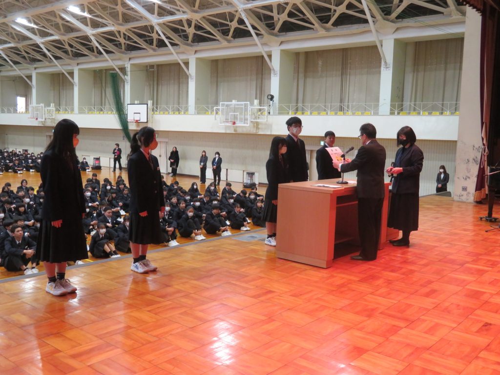 本日、無事終業式を迎えることができました。本日もたくさんの生徒を表彰することができました。生徒が様々な分野で力を伸ばし、成果を出しているのはうれしいことです。また、2学期は行事が盛りだくさんで大変だったと思いますが、どの行事も生徒のチームワークのよさが随所にみられ、いつも感心させられました。明日からの冬休みも充実した時間を過ごしてほしいと思います。